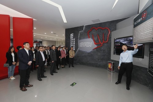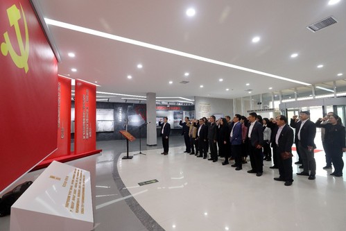 参观期间,党员们肃立在党旗面前,举起右手,重温了入党誓词。