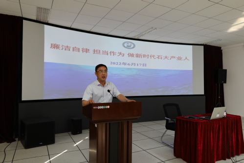 吴强明以《廉洁自律 担当作为 做新时代石大产业人》为题讲廉政党课。他指出,中石大科教集团是学校适应高等教育深化综合改革的新形势,在高校所属企业改制的大背景下,统筹考虑教学科研、学科建设、人才培养、成果转化的实际需求而设立,是立足新发展阶段、贯彻新发展理念、构建新发展格局、推动高质量发展的战略布局。