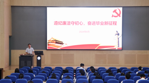 最后,李健对全体毕业生党员开展廉洁从业教育。纪律是管党治党的戒尺,也是党员、干部约束自身行为的标准和遵循。李健通过讲解案例,引导毕业生党员在步入工作岗位之后,扣好廉洁从业“第一粒扣子”,筑牢廉政长城,在以后的人生道路上走地更稳、更坚实。
